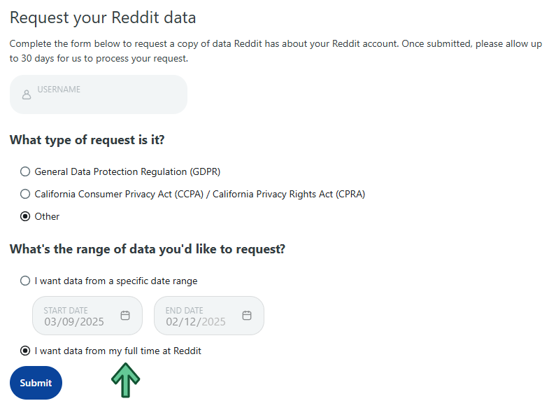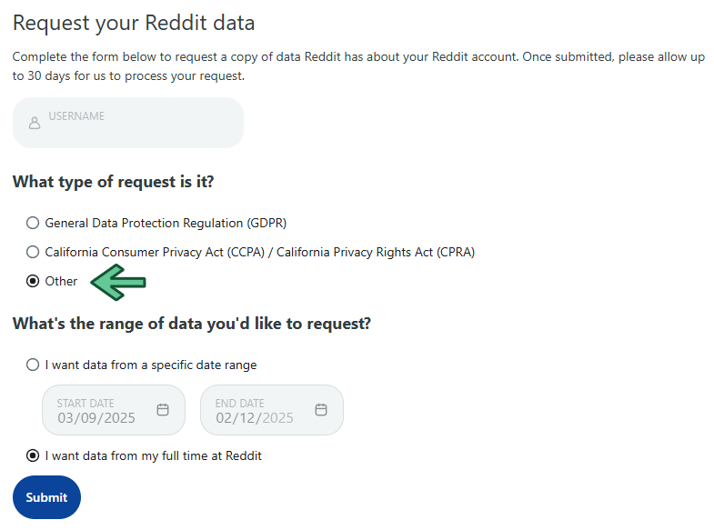 Reddit provides three options for the type of your data extraction request: